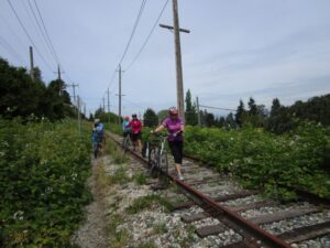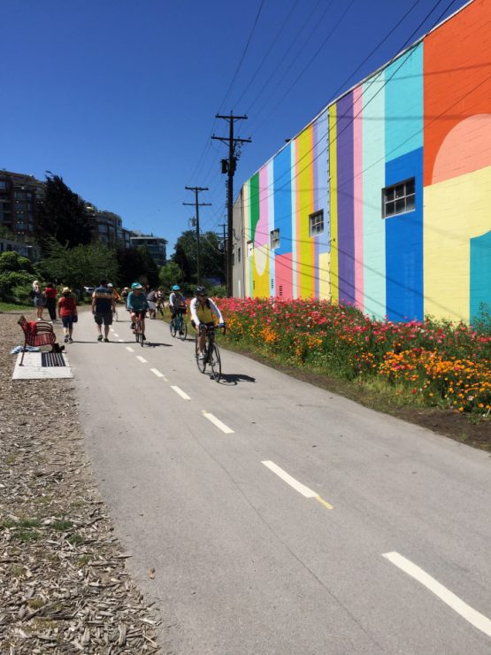 The Arbutus Greenway is one of the most popular places in Vancouver! Stephen Rees captures happy riders and walkers in this vibrant photo taken near 66th & Fir Park art is a tribute to the old railway tracks.
