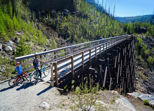 The Myra Canyon is one of the most exciting and scenic bike rides in BC! On this section of the Kettle Valley Railway there are 16 wood trestles, 2 steel bridges, and 2 tunnels. Start from the east entrance at Myra Station and ride west seeing as many of the trestles and tunnels as time and little legs allow! Or keep going …. on to Chute Lake and Wahoo! downhill to Naramata and Penticton! For an all new map with turn by turn directions, things to see along the way, and connecting routes, pick up a copy of the new book Let’s Go Biking to the Okanagan & Beyond. Available in BC bookstores, bikeshops and gift shops or order book and ebook online at Let’s Go Biking Books.
