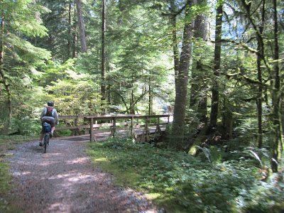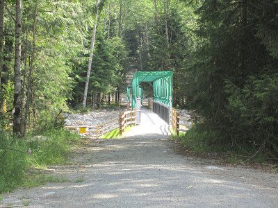 Bear Island Bridge joins trail on east side of river – beside the Seymour Hatchery.  Look for spawning salmon in the fall.